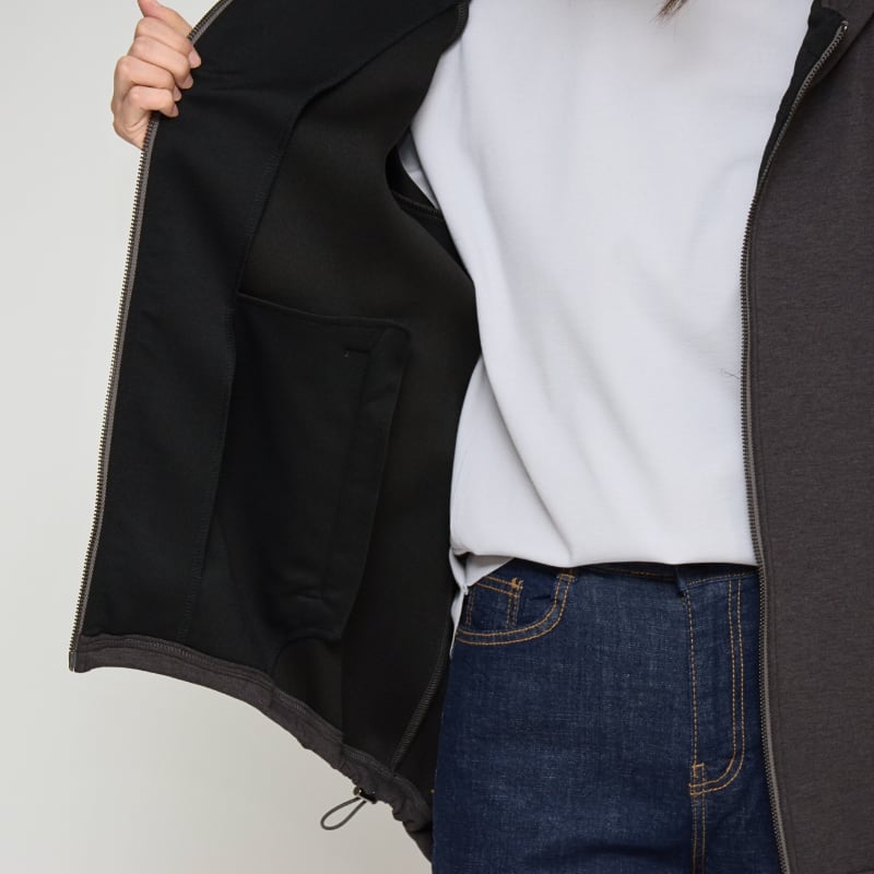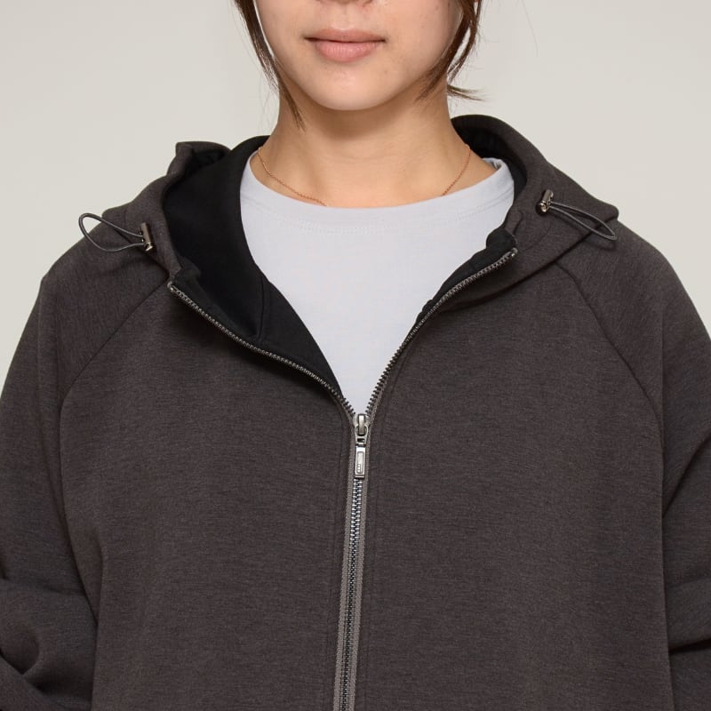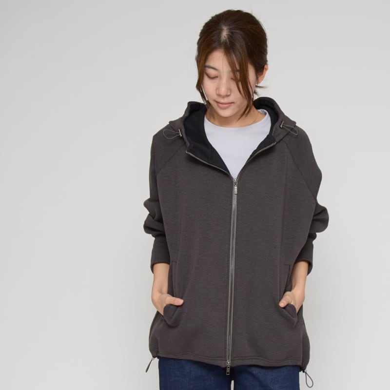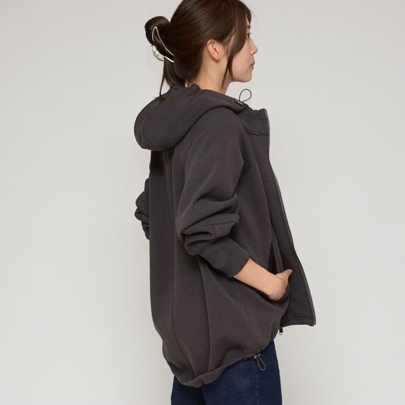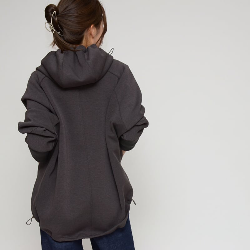 フードは立体感を調整でき、裾は絞ることでシルエットの変化を楽しめます。