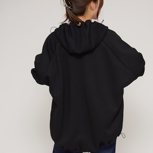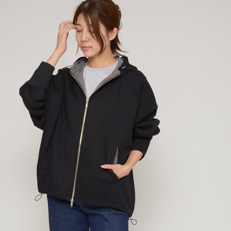 フードは立体感を調整でき、裾は絞ることでシルエットの変化を楽しめます。