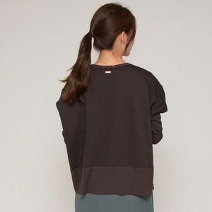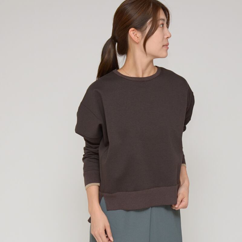 袖先、ネック、裾には本物のニット素材を使用し、上品なハイゲージニットのような見た目を実現。