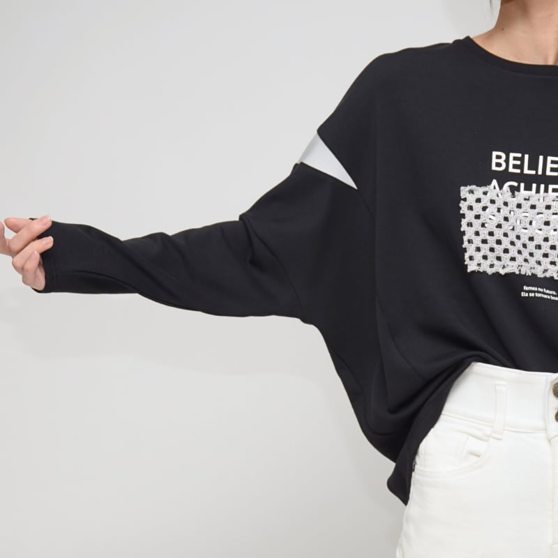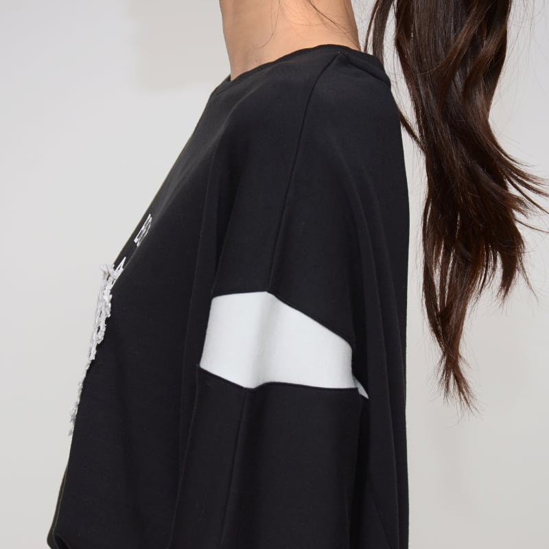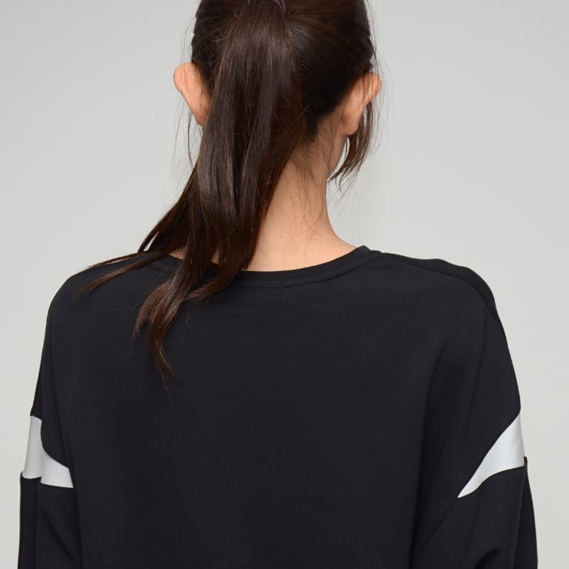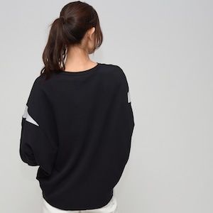 袖にさりげなく施された配色切替えが、横顔をおしゃれに演出し、メリハリのある印象に。