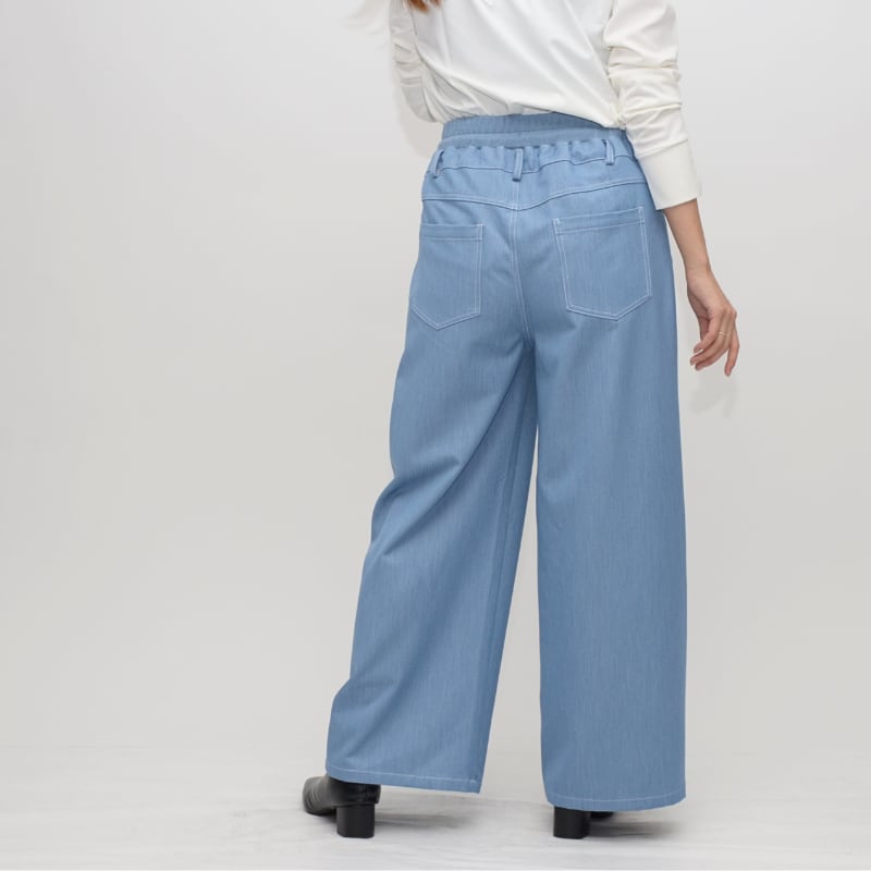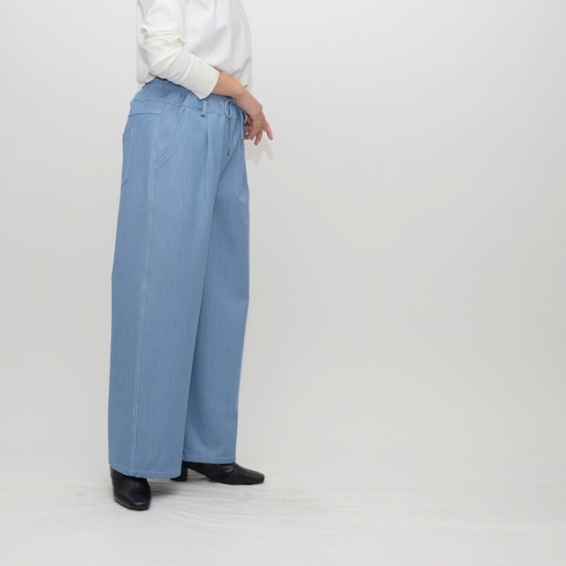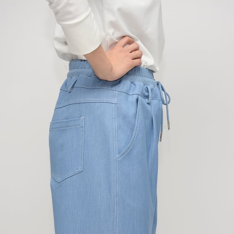 デニムのような見た目でありながら、加工感のない上品な表面で、カジュアルすぎず高見えします。