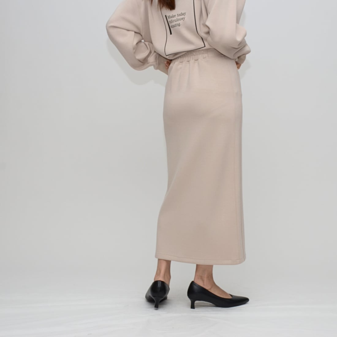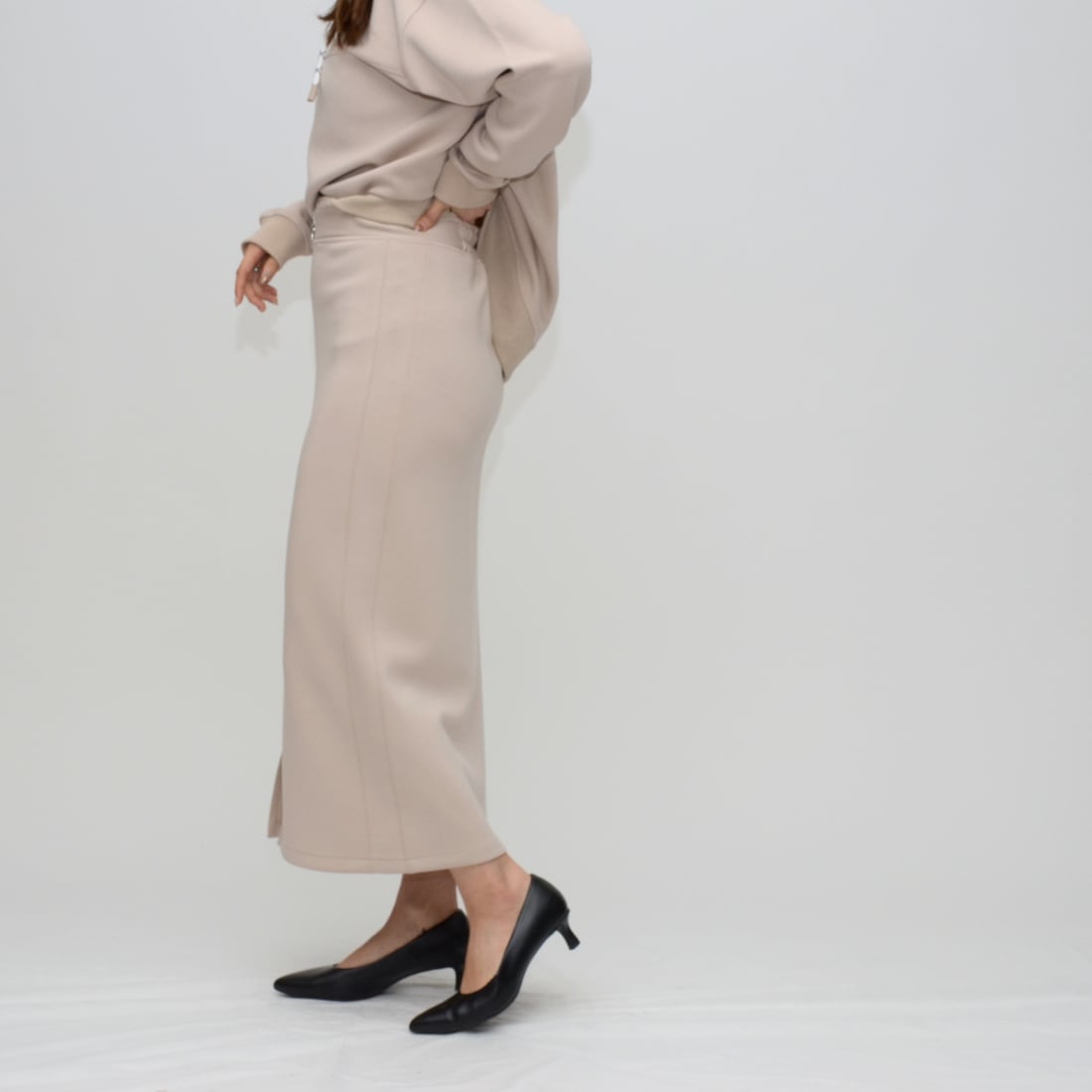 足元に抜け感を作りつつ、上品な歩き姿を演出するスリットデザインを採用。