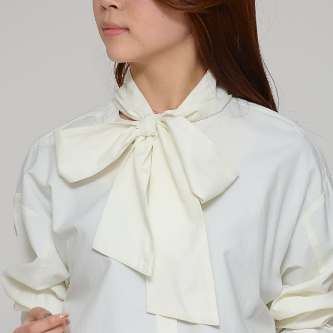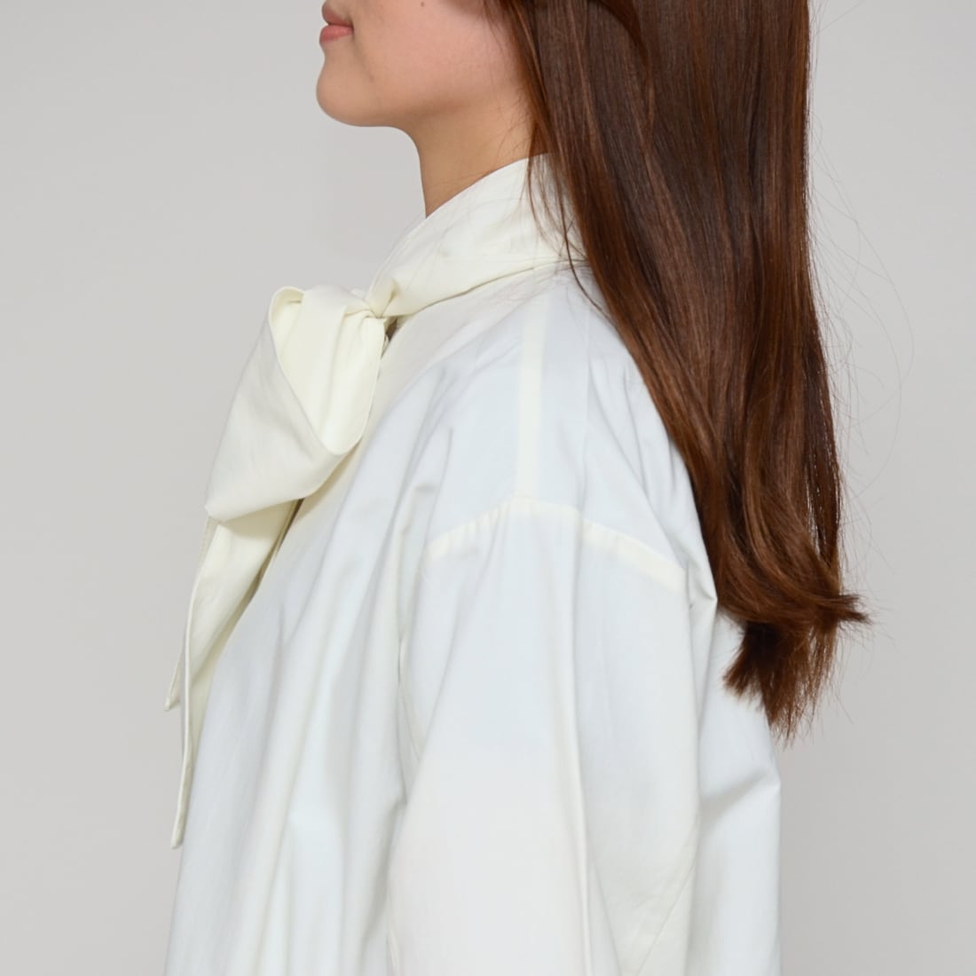 付属の共布ヒモ(タイ)を取り外せる設計。ボウタイ、リボン、あるいは取り外してバンドカラーなど、シーンに合わせて襟元の印象をコントロール。
