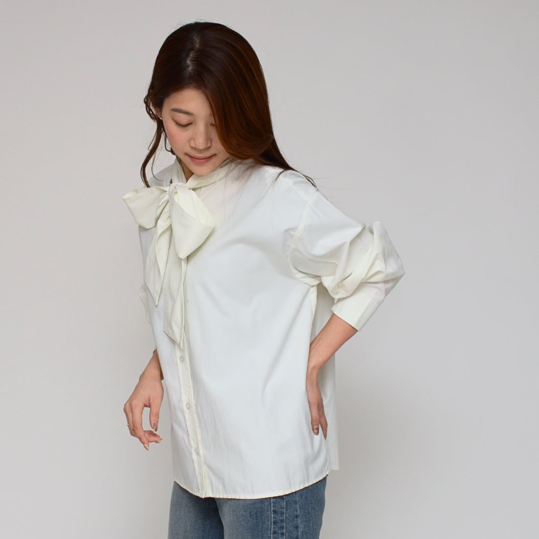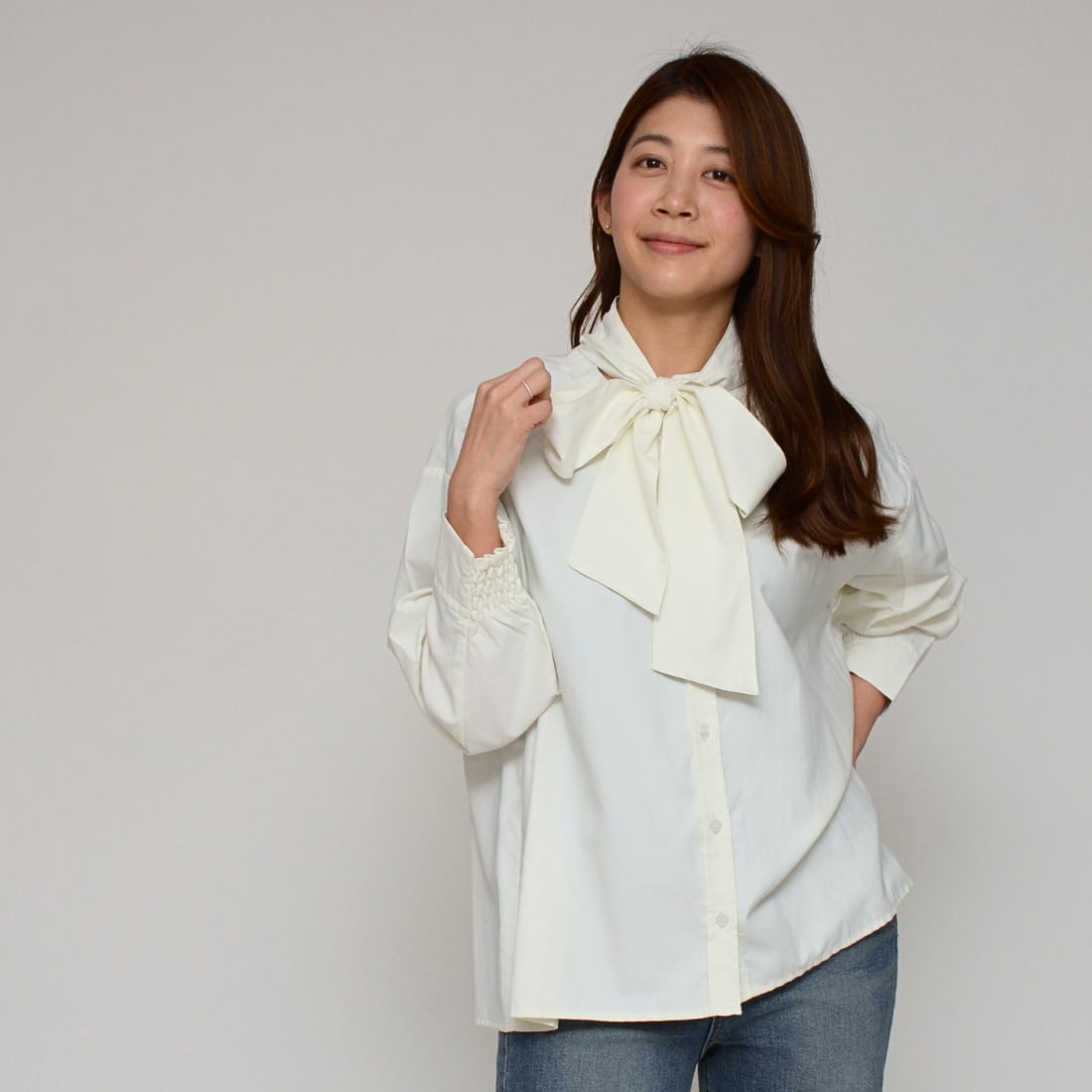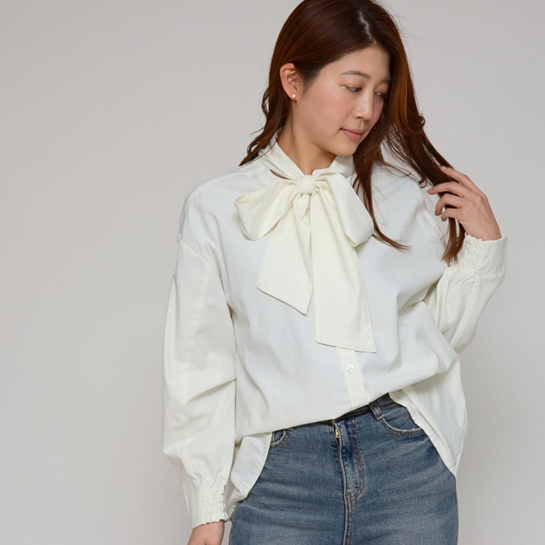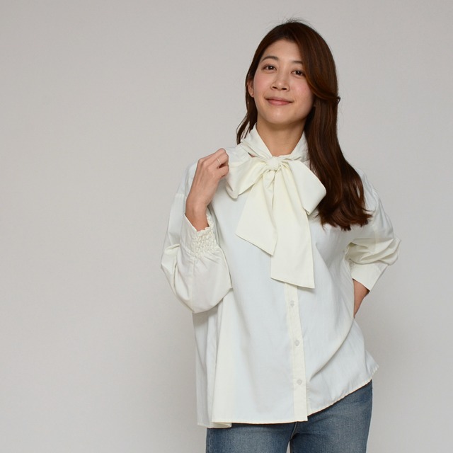 ・甘すぎない大人のリボンブラウスを探している。