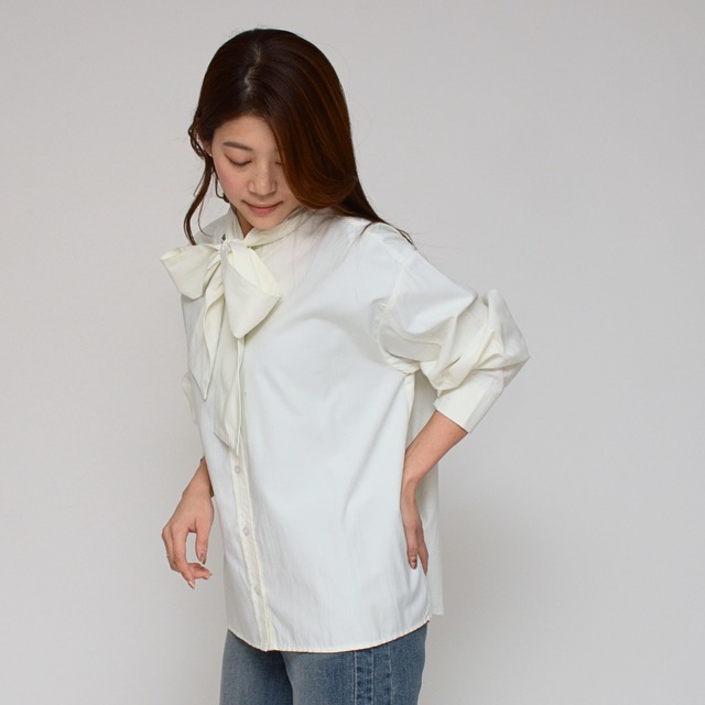 「ボウタイが描く端正な表情、ノーカラーが魅せる抜け感。