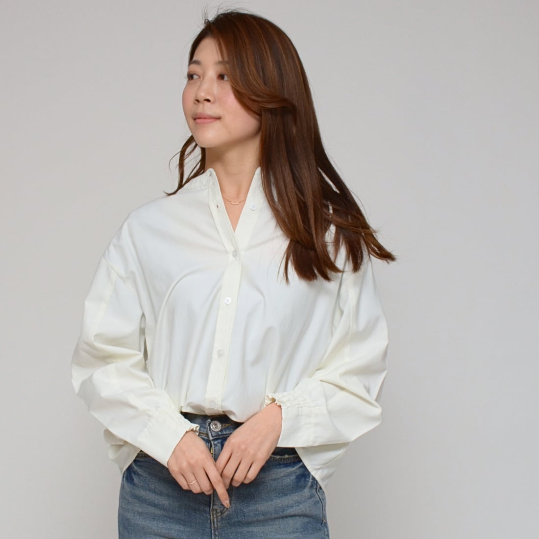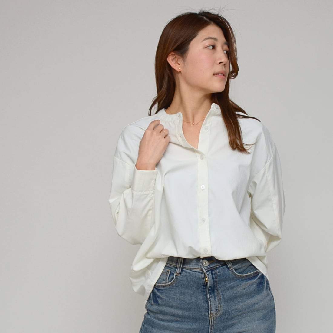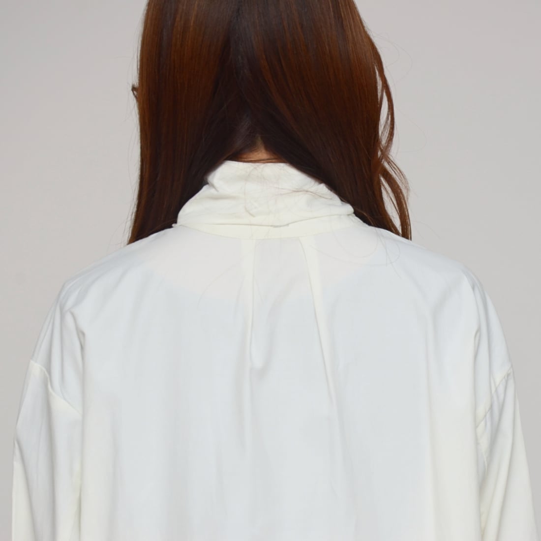 ヒモを抜けばミニマルなノーカラーシャツとして、