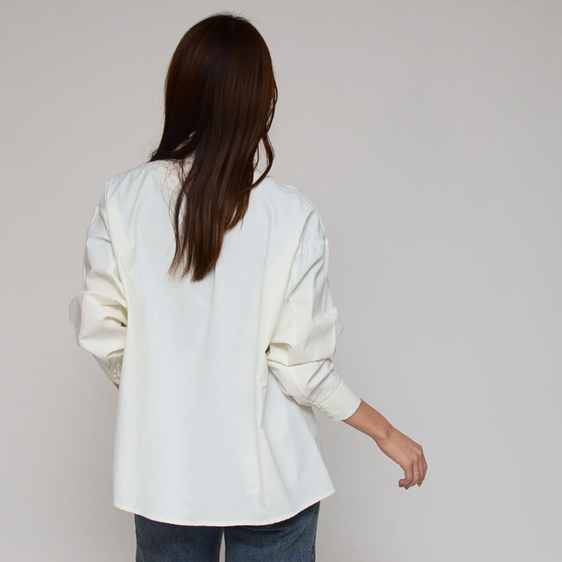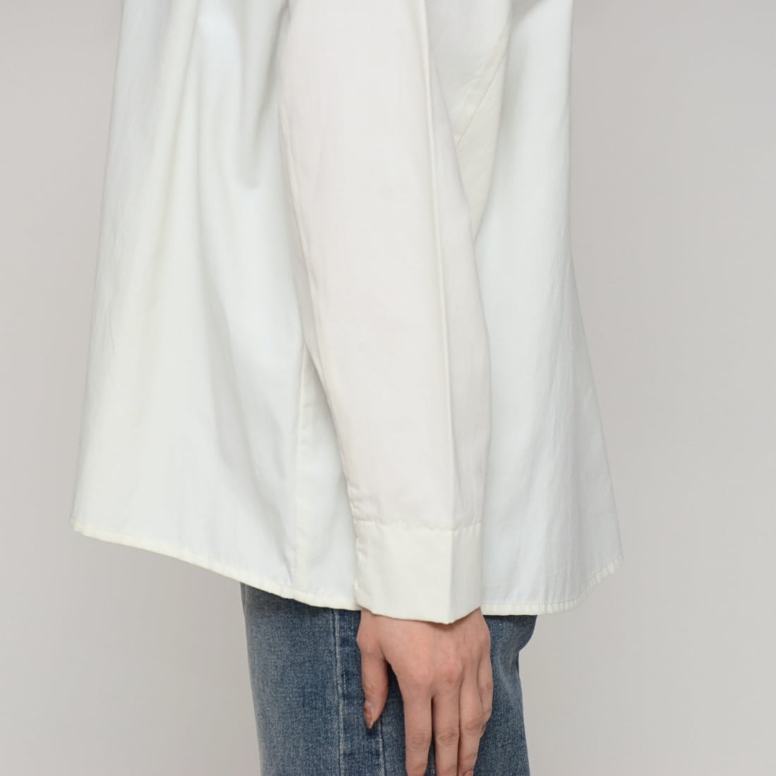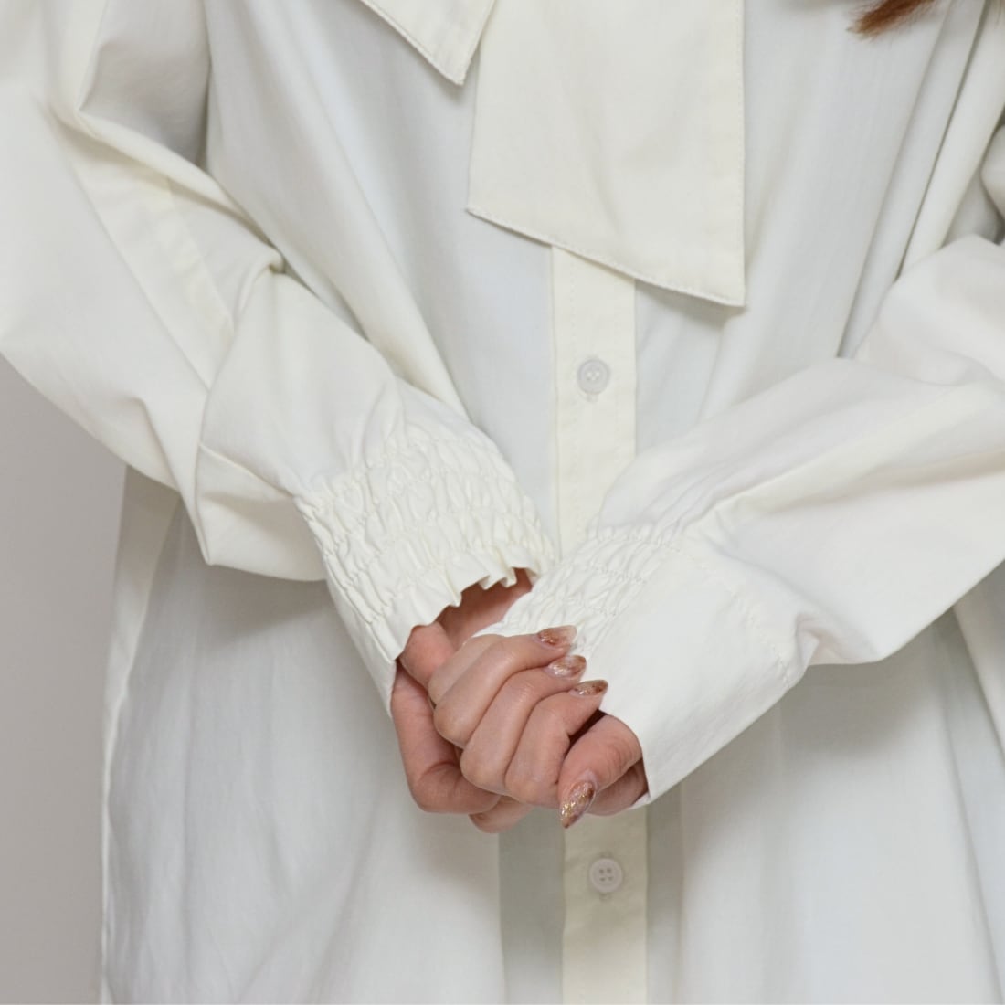 袖先に施されたゴム入りのギャザー仕様。スムーズな袖まくりを可能にし、ボリューム袖のフォルムを美しく固定。