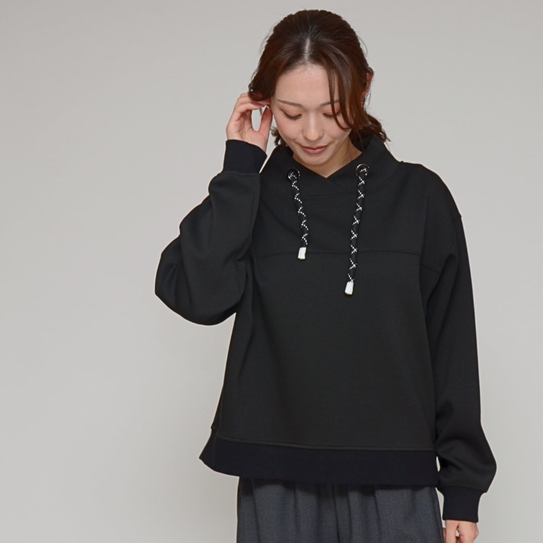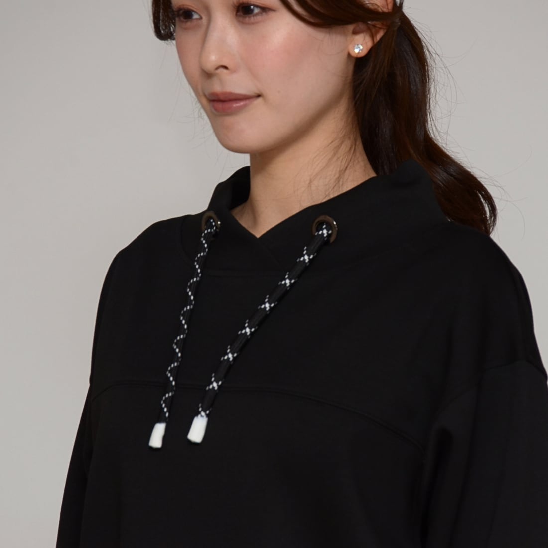【小顔効果】フェイクパーカー・レタリングプルオーバー - LEI-25137 ブラック ‐