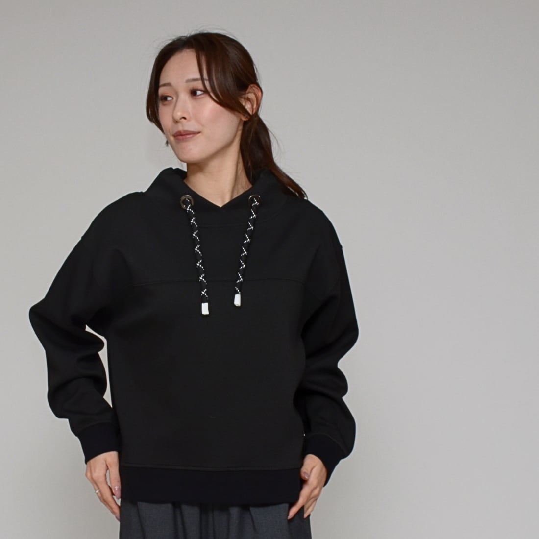 フードの「立ち上がり」だけを計算した独自パターン。首周りに適度なボリュームを作ることで、視覚的な小顔ラインを構築。