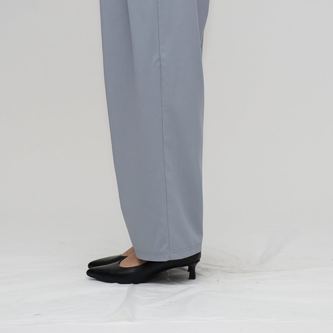 裾を細く絞ることで、ボリュームボトム特有の重たさを解消。フラットシューズからヒールまで、幅広いスタイリングに対応。