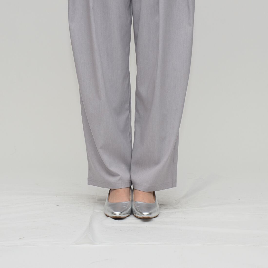 外側へ広がるアウトタックとは異なり、内側に折ることで腰周りをスマートに見せる視覚効果。タックによる縦のラインが、シルエットに奥行きをプラス。