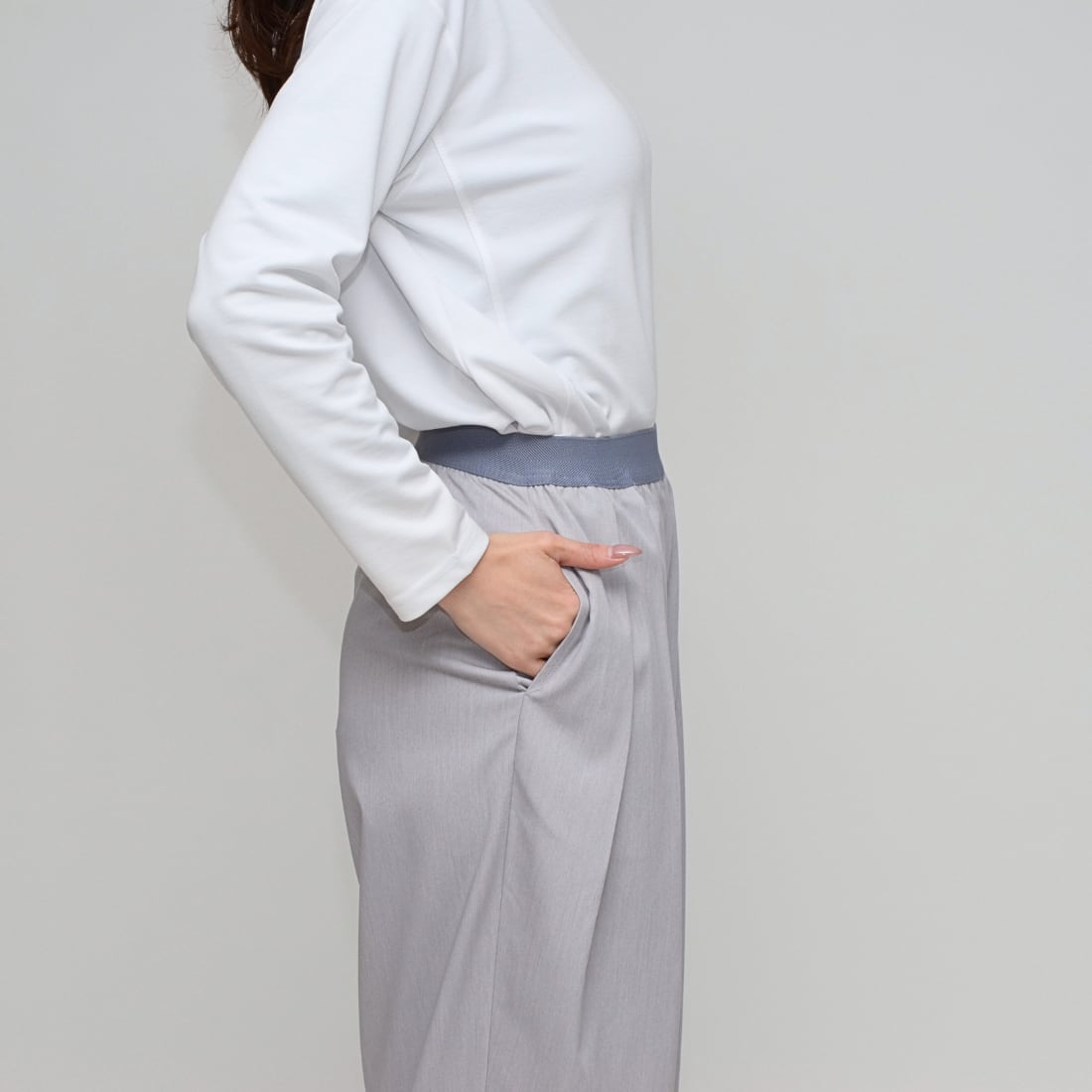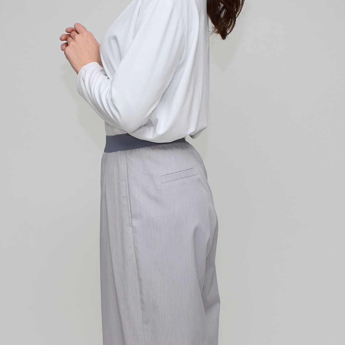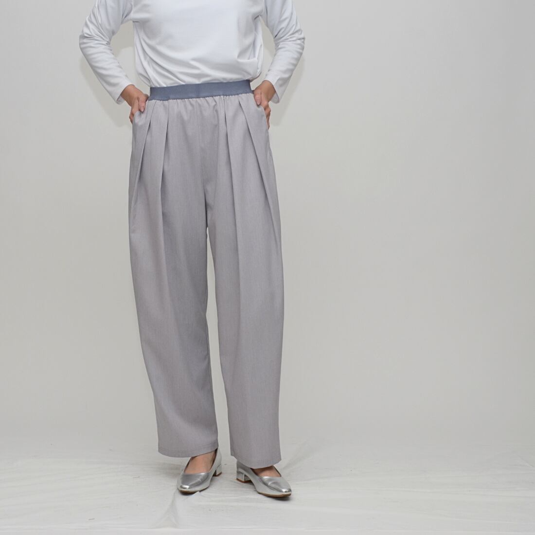 インタックの立体感とウエストゴムの解放感で創る、洗練コクーンシルエット」