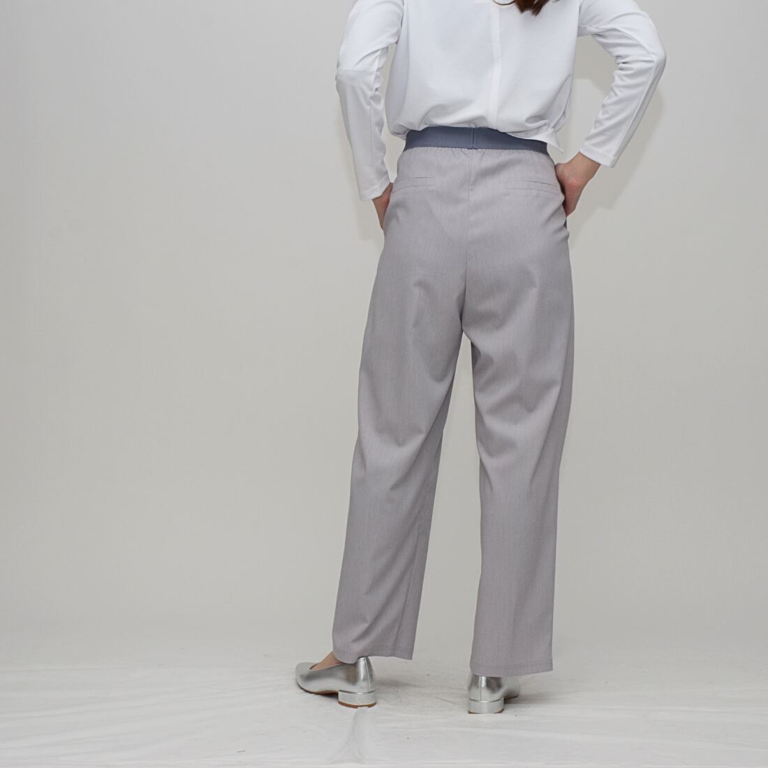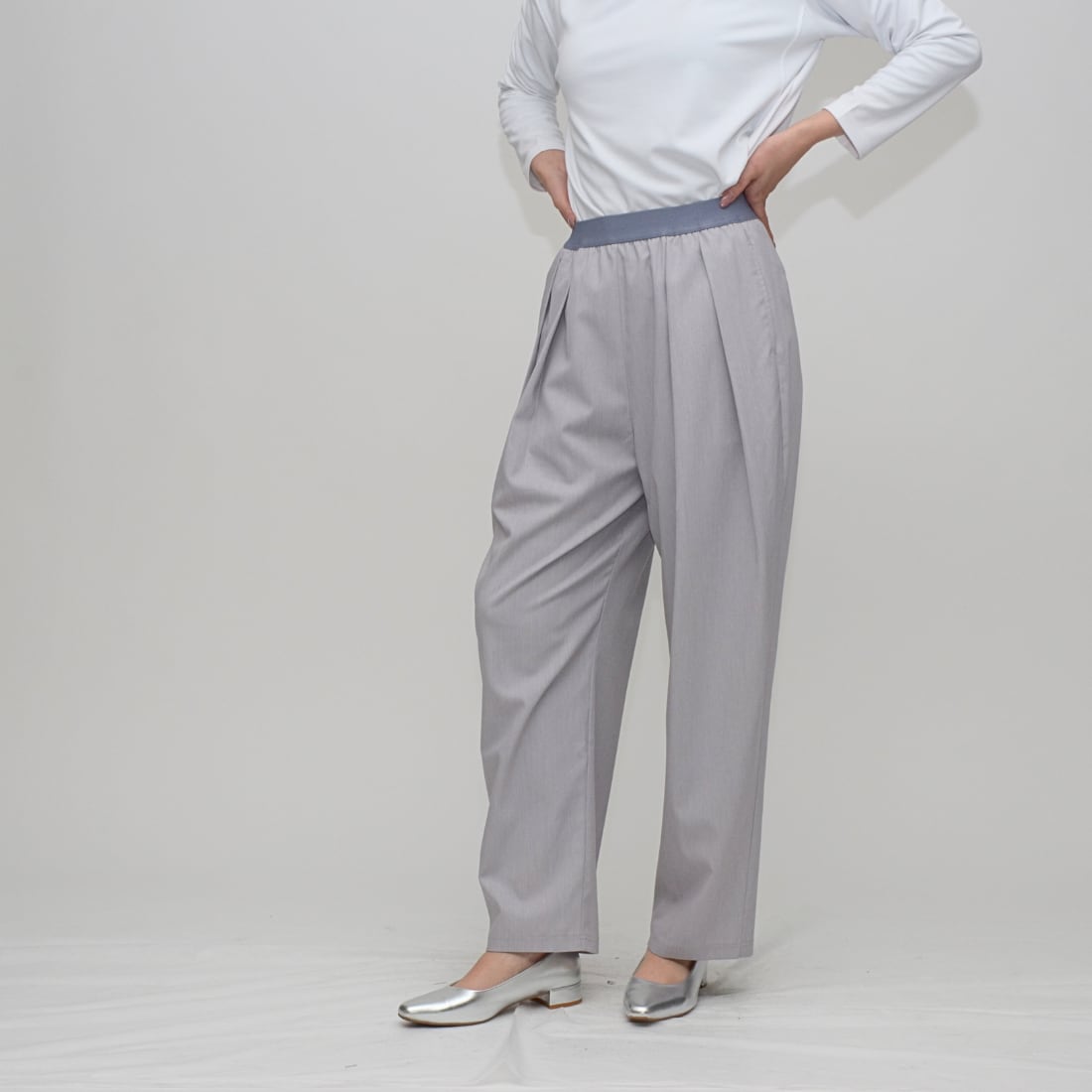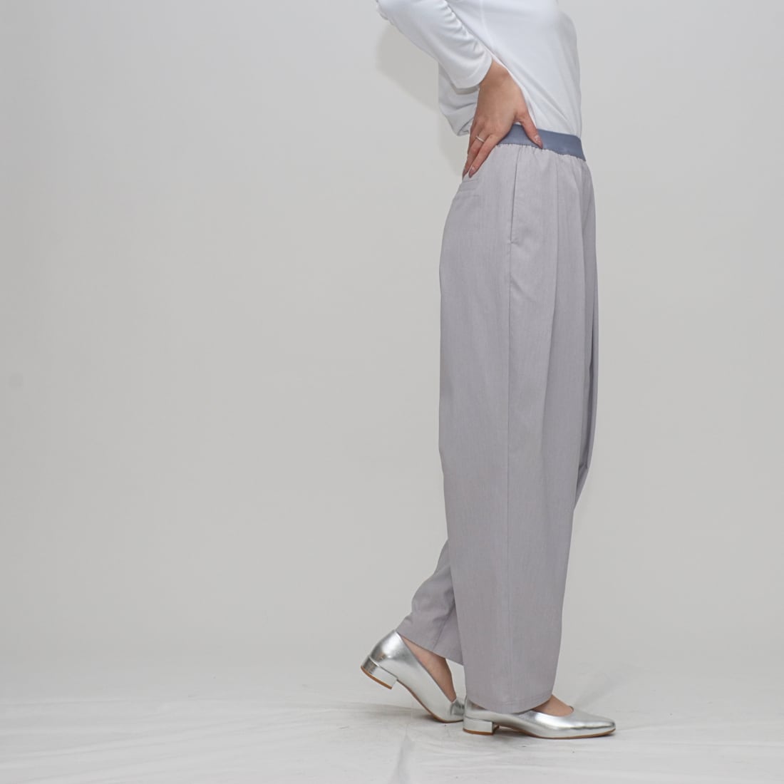 インタックの立体感とウエストゴムの解放感で創る、洗練コクーンシルエット」
