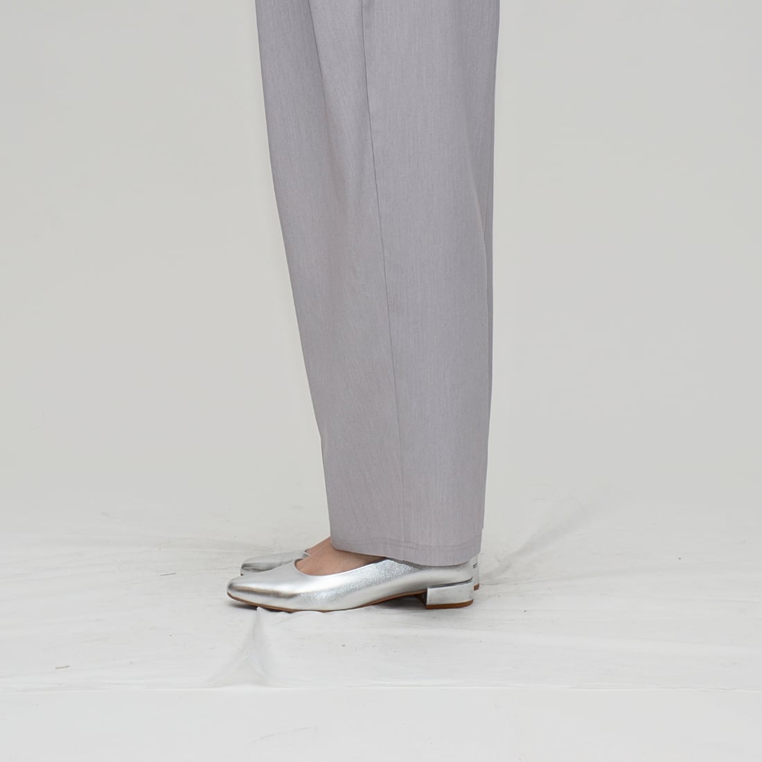 裾を細く絞ることで、ボリュームボトム特有の重たさを解消。フラットシューズからヒールまで、幅広いスタイリングに対応。