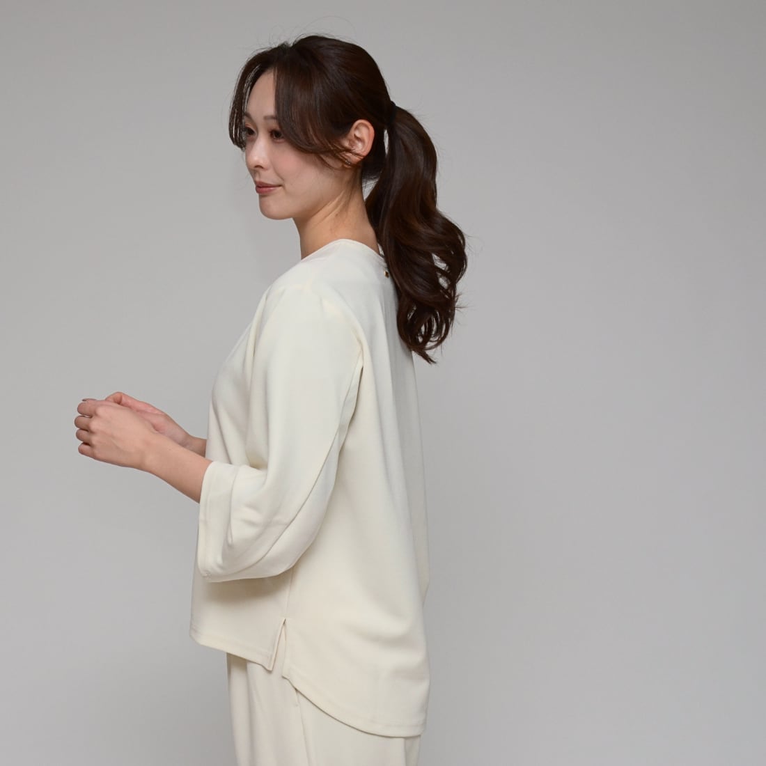 シンプルながら計算されたカッティング。ジュエリーやボトムスの合わせ次第で、ビジネスからフォーマルまで幅広く網羅。