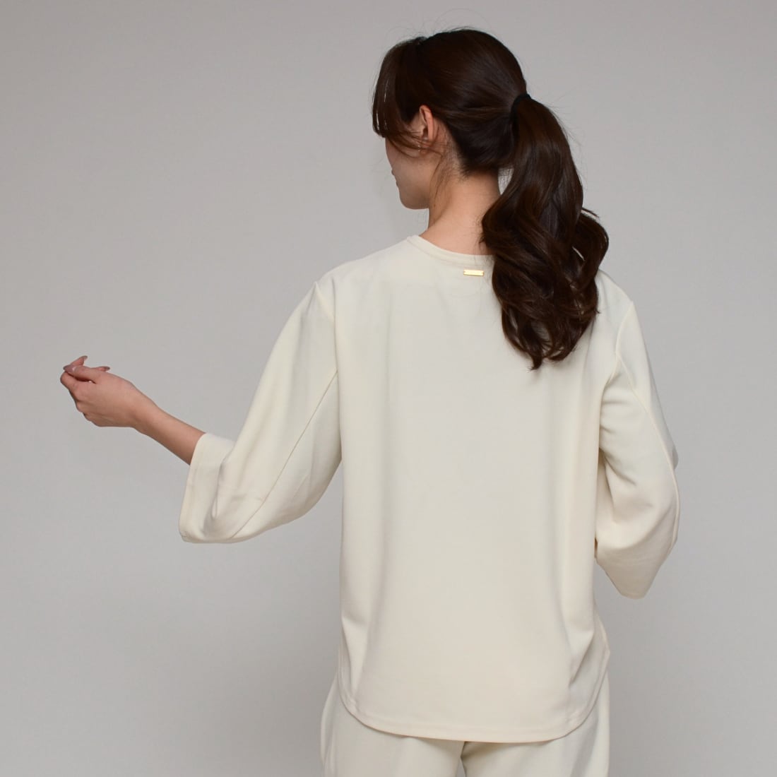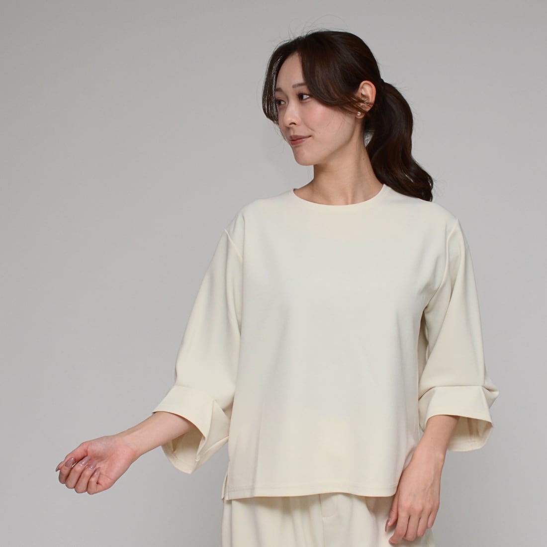 とろみのある柔らかな質感が、女性らしい柔和なシルエットを構築。透けにくく、一枚でも安心して着用可能。