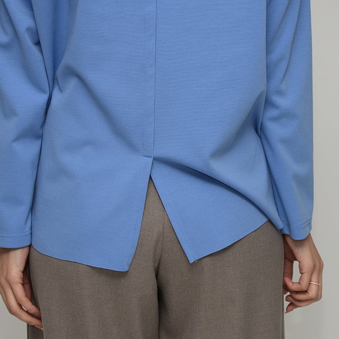 背面に深く入ったスリットが、バックスタイルに抜け感を演出。重ね着した際も裾がもたつかず、流れるようなラインを維持。
