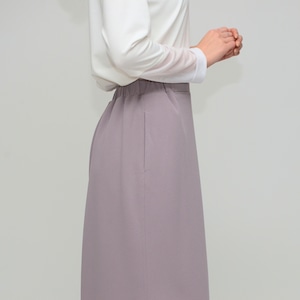 一般的なマーメイドスカートよりも後方にボリュームを持たせることで、ヒップラインをさりげなくカバー。横から見た時の立体感が、大人の余裕を演出。