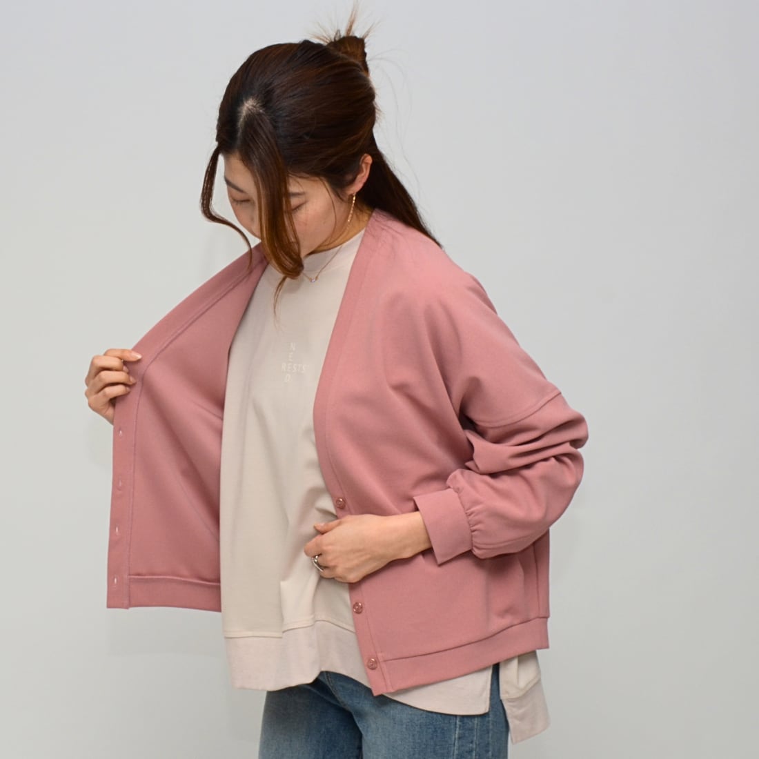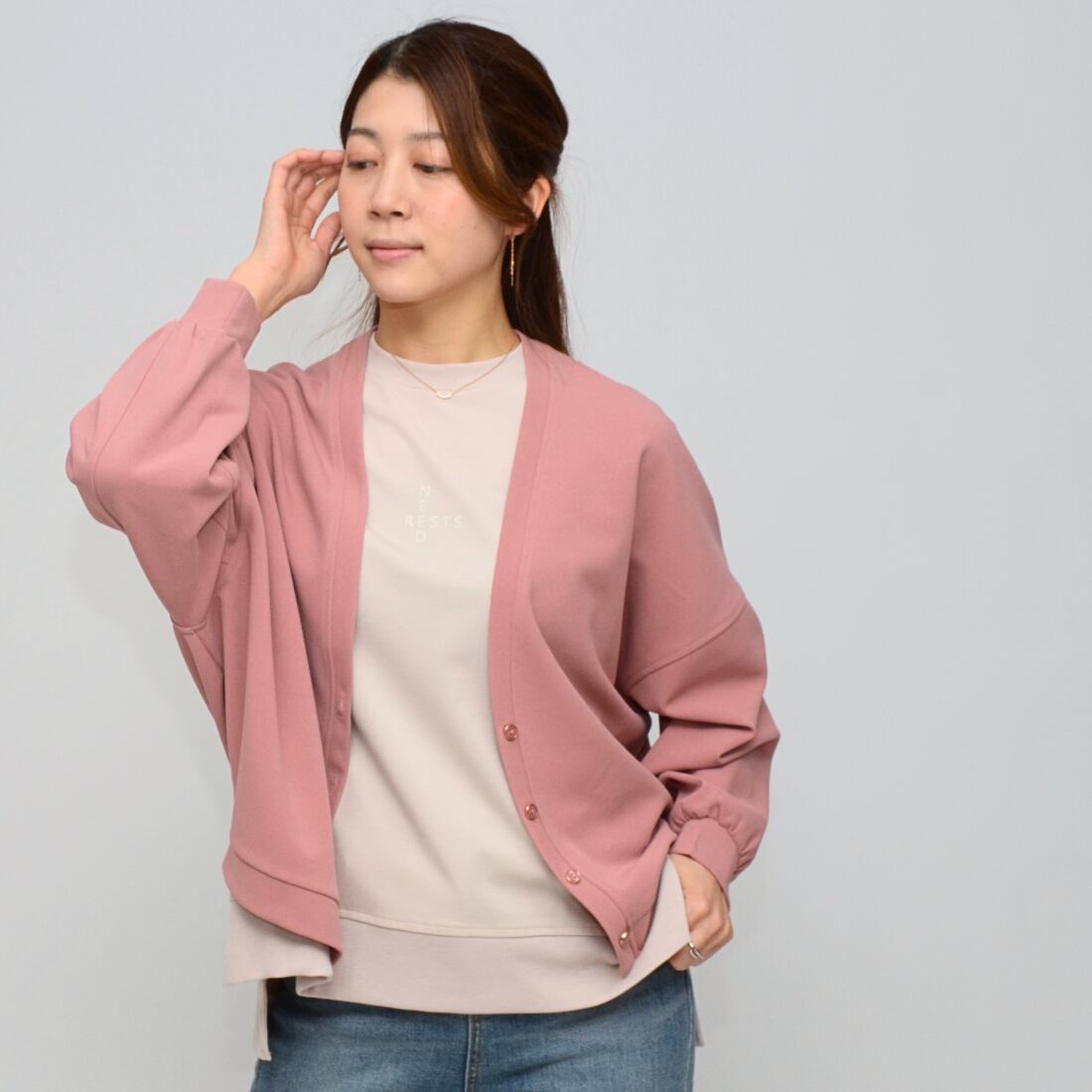 【超軽量、シーン問わず】梨地ダブルフェイス・バックVネックカーディガン ‐ LEQ-2630 ダルピンク ‐