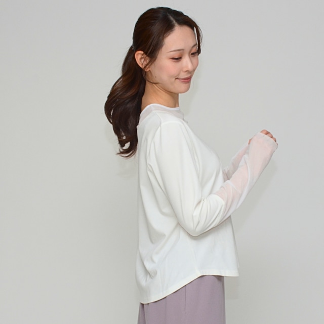 最大のポイントは、ネックラインと袖先に配した繊細な「チュール素材」。
