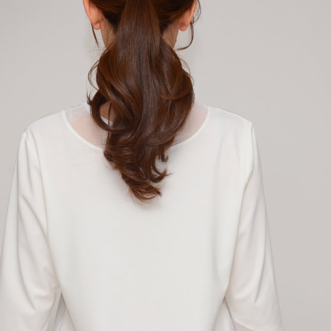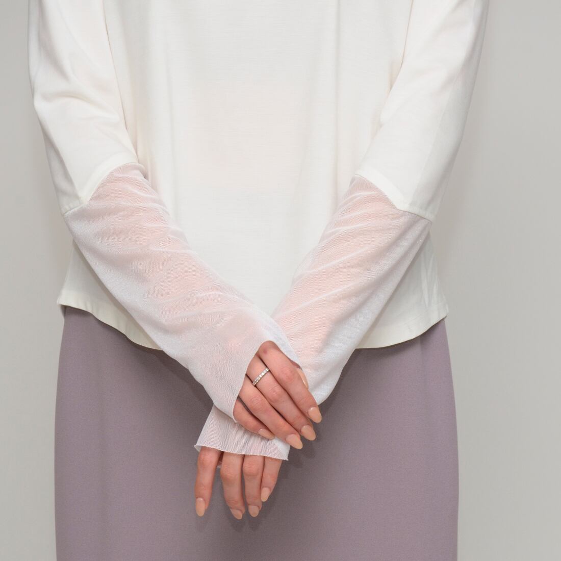 首元と袖先に透け感のあるチュールを配置。レイヤードした際に絶妙な「抜け感」を生み出し、顔回りと手元を華やかにクラスアップ。