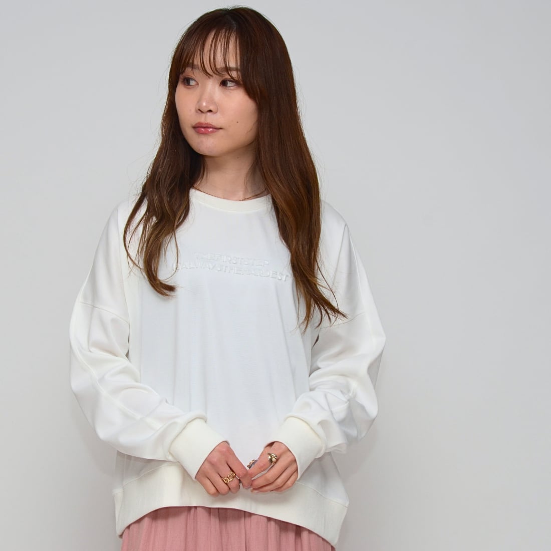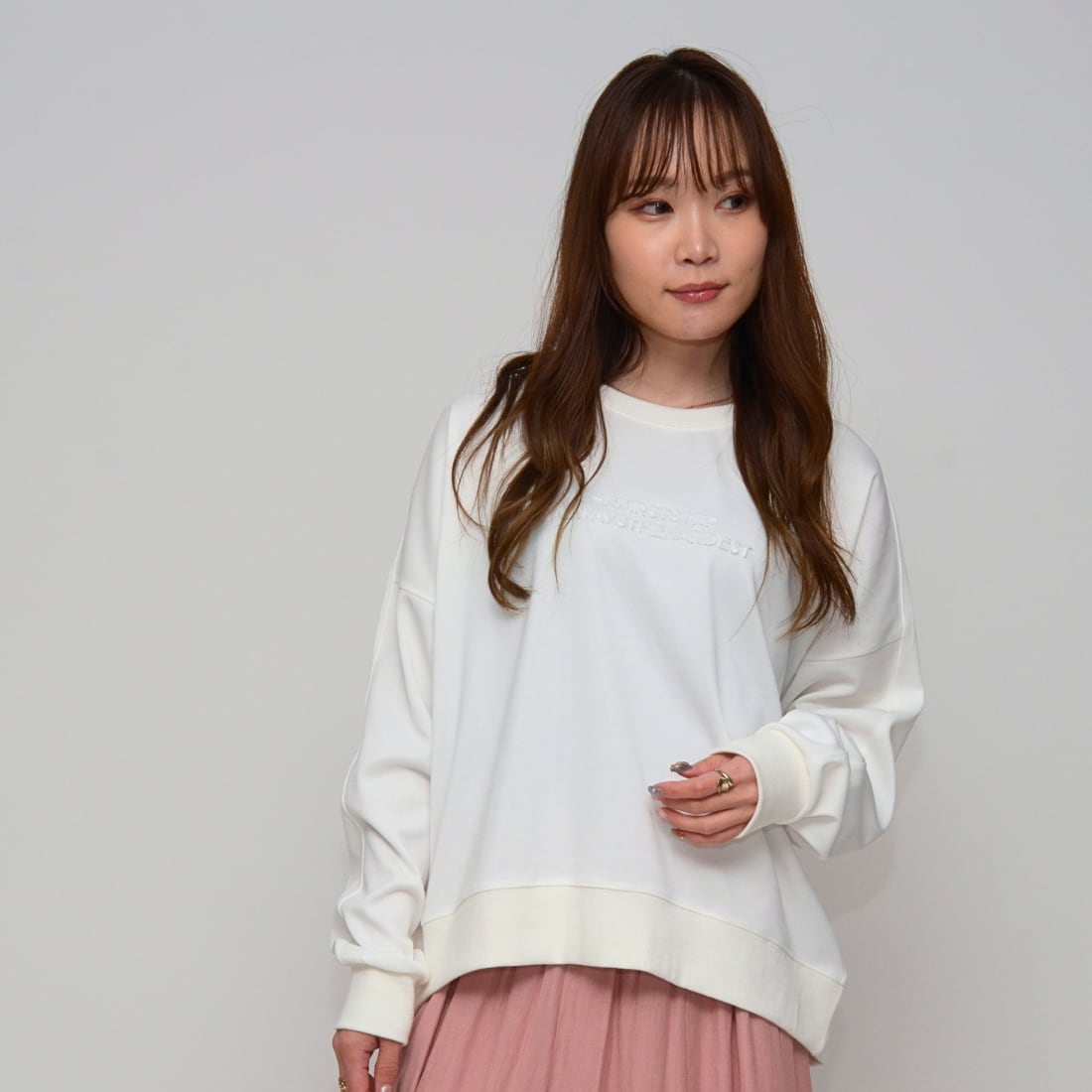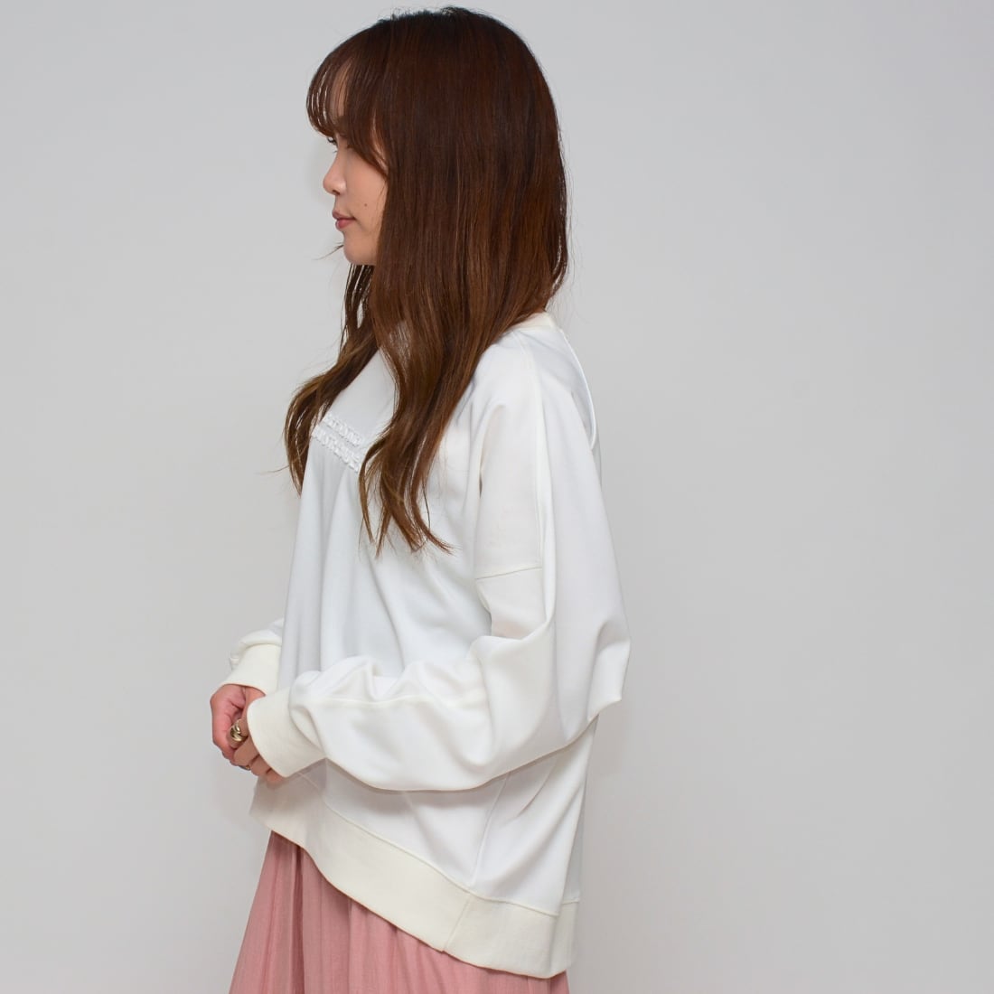 前後差をつけた「ややショート丈」が、ボトムスを選ばず