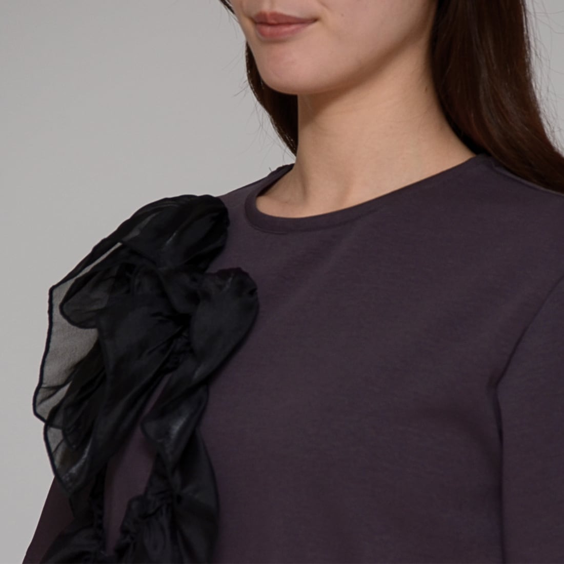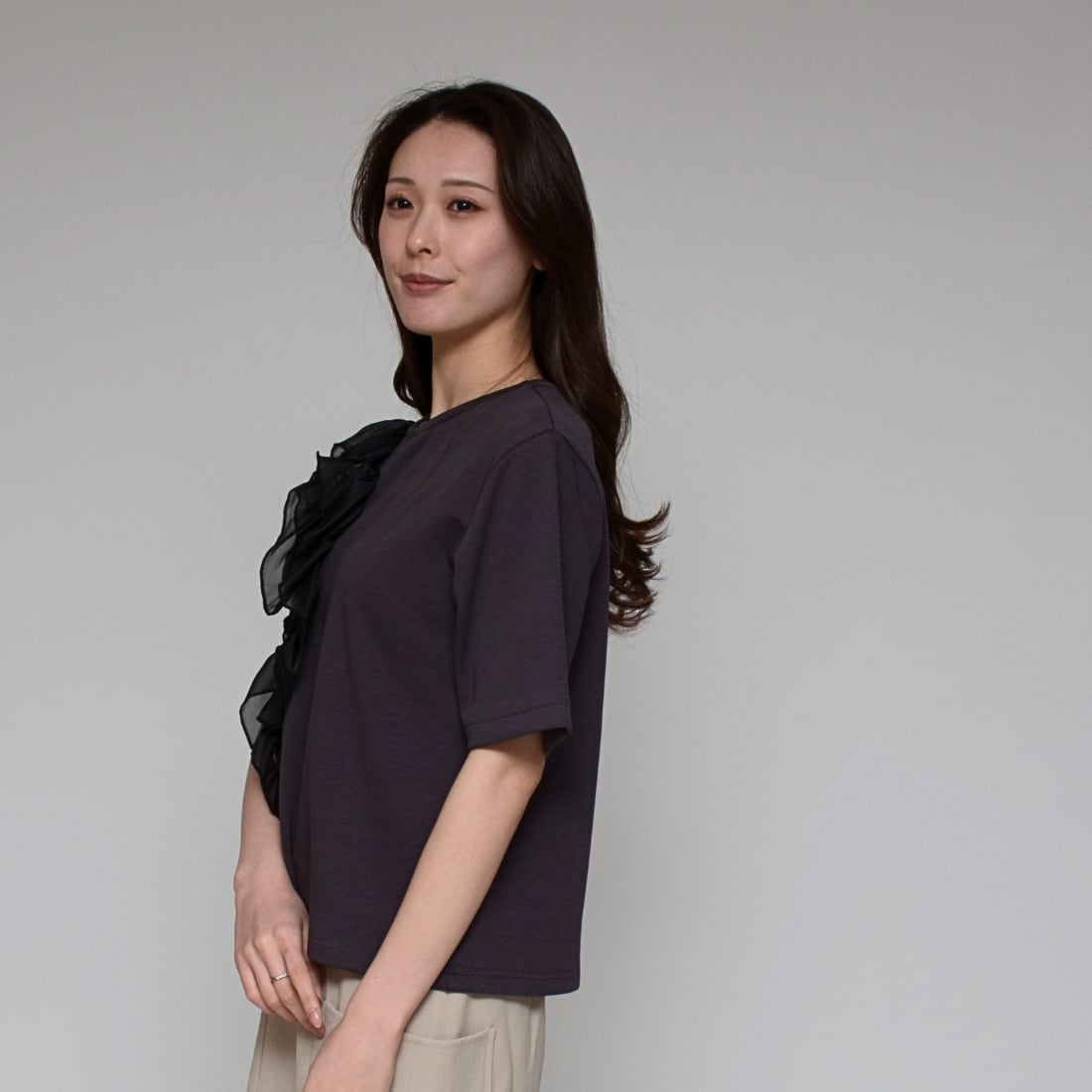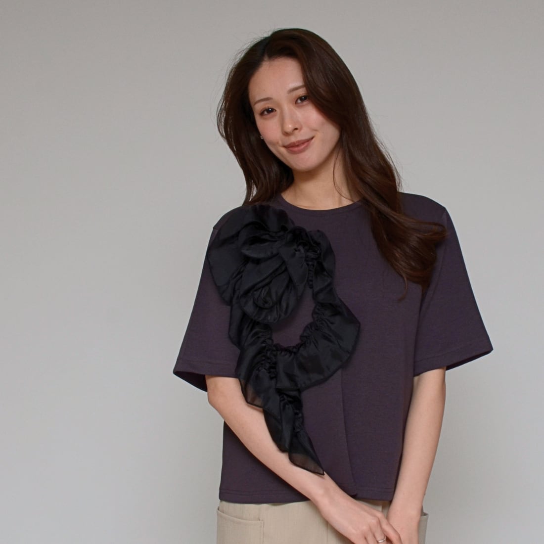 【主役級の一枚】 オーガンジーコサージュ・ストレッチT ‐ LEO-2614 チャコール ‐